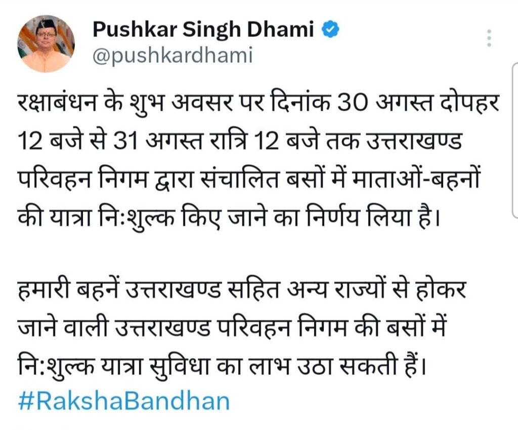 रक्षाबंधन के अवसर पर साथ ही मुख्यमंत्री धामी ने ट्वीट कर आज और कल दोनों दिन के लिए बहनो को सयगत देते हुए कहा है कि उत्तराखण्ड की बहने आज अर्थात 30 अगस्त की दोपहर 12 बजे से कल अर्थात 31 अगस्त की रात्रि 12 बजे तक उत्तराखण्ड की बसों में फ्री यात्रा कर सकती है।