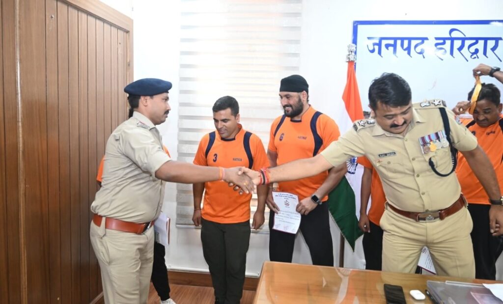 हरिद्वार। जनपद नैनीताल में आयोजित 21वीं प्रादेशिक अंतर्जनपदीय वाहिनी पुलिस तैराकी व क्रॉस कंट्री प्रतियोगिता में हरिद्वार के गोताखोर मनोज बहुखंडी जल पुलिस, हरिद्वार द्वारा बेहतरीन प्रदर्शन करते हुए 3 गोल्ड व 1 सिल्वर मेडल जीत कर हरिद्वार पुलिस का मान बढ़ाया। एसएसपी हरिद्वार अजय सिंह द्वारा तैराकी व क्रॉस कंट्री टीम के खिलाड़ियों से मिलकर सभी को “शाबाशी” देते हुए भविष्य में ऑल इंडिया लेवल पर होने वाली प्रतियोगिताओं के लिए अग्रिम शुभकामनाएं दीं।