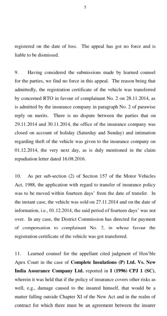 काशीपुर। उत्तराखंड राज्य उपभोक्ता आयोग ने वाहन ट्रांसफर से 14 दिन के अन्दर चोरी होने पर वाहन ट्रांसफर की सूचना बीमा कम्पनी को न देने के आधार पर बीमा क्लेम निरस्त करने को गलत माना तथा बीमा कम्पनी की अपील निरस्त कर दी।