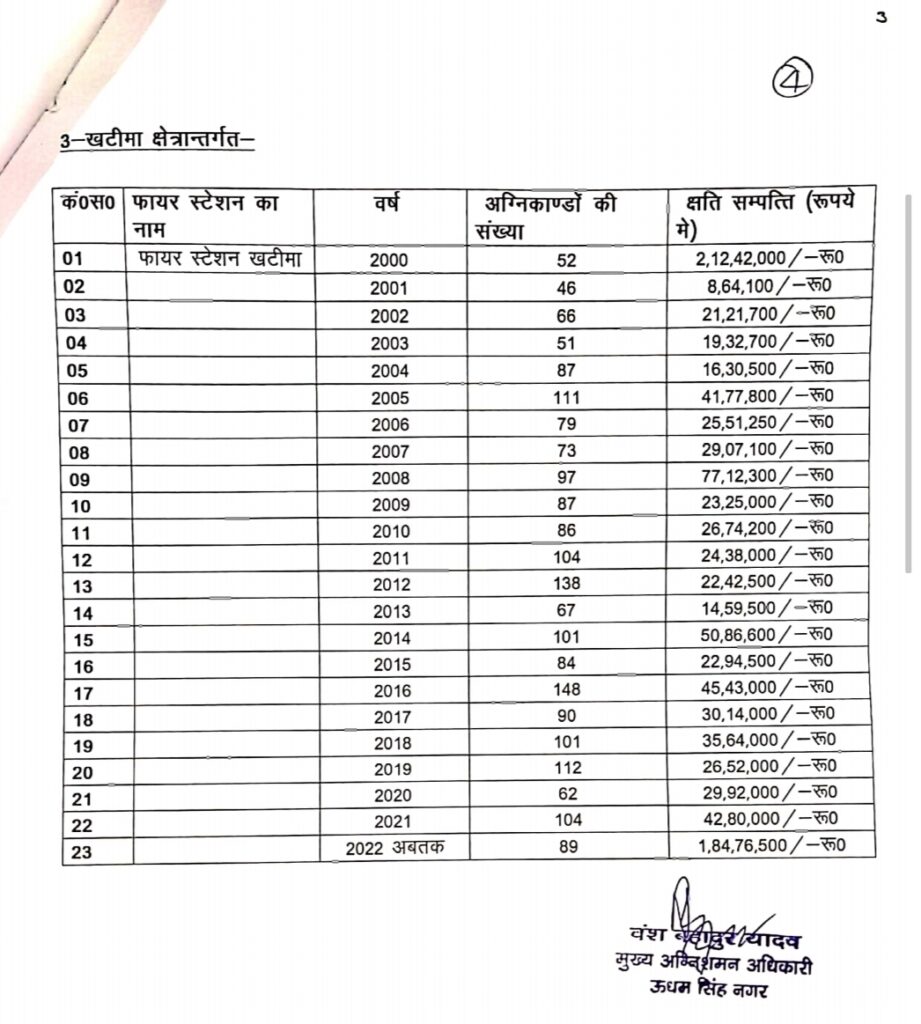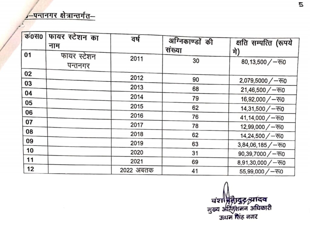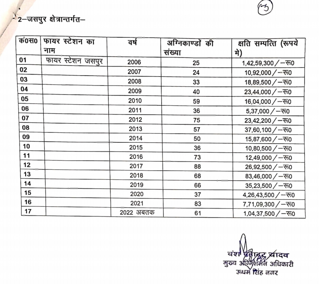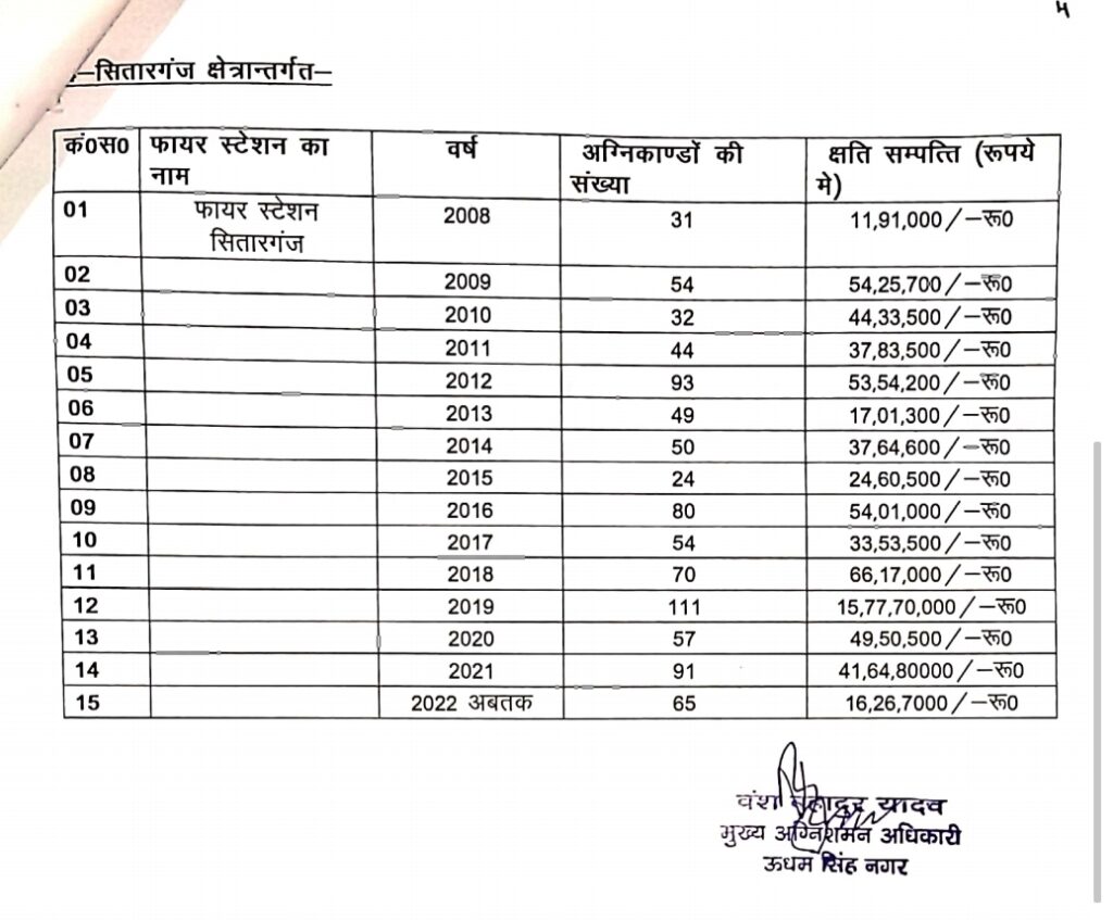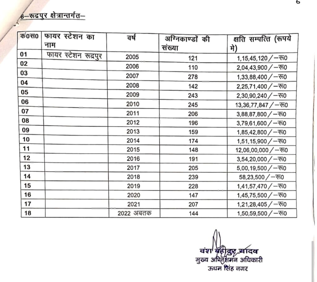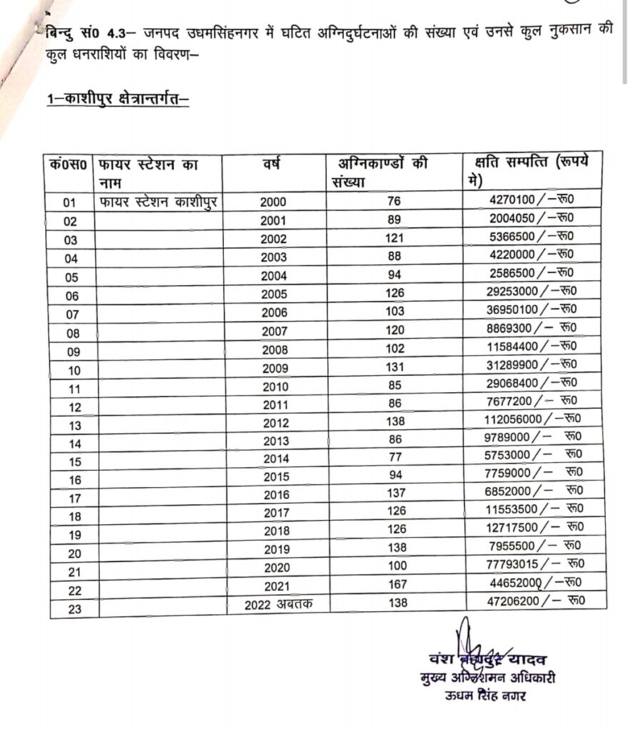 नदीम को वर्षवार उपलब्ध सूचना के अनुसार वर्ष 2000 में 128 अग्निकाण्डों में 225 लाख, 2001 में 135 अग्निकाण्डों में 28 लाख, 2002 में 187 अग्निकाण्डों में 74 लाख, 2003 में 139 अग्निकाण्डों में 61 लाख, 2004 में 181 अग्निकाण्डों में 42 लाख, 2005 में 358 अग्निकाण्डों में 449 लाख, 2006 में 317 अग्निकाण्डों में 742 लाख, 2007 में 495 अग्निकाण्डों में 262 लाख, 2008 में 405 अग्निकाण्डों में 449 लाख, 2009 मंे 555 अग्निकाण्डों में 644 लाख, 2010 में 507 अग्निकाण्डों में 1714 लाख, 2011 में 506 अग्निकाण्डों में 613 लाख, 2012 में 730 अग्निकाण्डों में 1807 लाख, 2013 में 486 अग्निकाण्डों में 373 लाख, 2014 में 531 अग्निकाण्डों में 329 लाख, 2015 में 448 अग्निकाण्डों में 1356 लाख, 2016 में 705 अग्निकाण्डों में 575 लाख, 2017 में 641 अग्निकाण्डों में 719 लाख, 2018 में 666 अग्निकाण्डों में 384 लाख, 2019 में 718 अग्निकाण्डों में 2244 लाख, 2020 में 434 अग्निकाण्डों में 2333 लाख, 2021 में 721 अग्निकाण्डों में 2273 लाख तथा 2022 में (सूचना उपलब्ध कराने की तिथि 03 दिसम्बर तक) 538 अग्निकाण्डों में 1130 लाख रूपये से अधिक की सम्पत्ति का नुकसान हुआ है। नदीम को उपलब्ध फायर स्टेशन वार विवरणों के अनुसार फायर स्टेशन काशीपुर के क्षेत्रान्तर्गत वर्ष 2000 से 2022 तक 2548 अग्निकाण्डों में कुल 51 करोड़ 72 लाख 26 हजार 165 रूपये की सम्पत्ति का नुकसान हुआ है जबकि जसपुर फायर स्टेशन के क्षेत्रान्तर्गत वर्ष 2006 से 2022 तक 911 अग्निकण्डों में 17 करोड़ 64 लाख 97 हजार 500 रूपये का नुकसान हुआ है। खटीमा फायर स्टेशन क्षेत्रान्तर्गत वर्ष 2000 से 2022 तक 2023 अग्निकाण्डों में 10 करोड़ 31 लाख 81 हजार 250 रूपये जबकि सितारगंज फायर स्टेशन क्षेत्रान्तर्गत 2008 से 2022 तक 905 अग्निकाण्डों में 22 करोड़ 25 लाख 14 हजार 948 रूपये की सम्पत्ति का नुकसान हुआ है। पंतनगर फायर स्टेशन के क्षेत्रान्तर्गत 2011 से 2022 तक 749 अग्निकाण्डों में 26 करोड़ 44 लाख 48 हजार 185 रूपये तथा रूद्रपुुर फायर स्टेशन क्षेत्रान्तर्गत 2005 से 2022 तक 3383 अग्निकाण्डों में 60 करोड़ 30 लाख 8 हजार 882 रूपये की सम्पत्ति का नुकसान हुआ है।