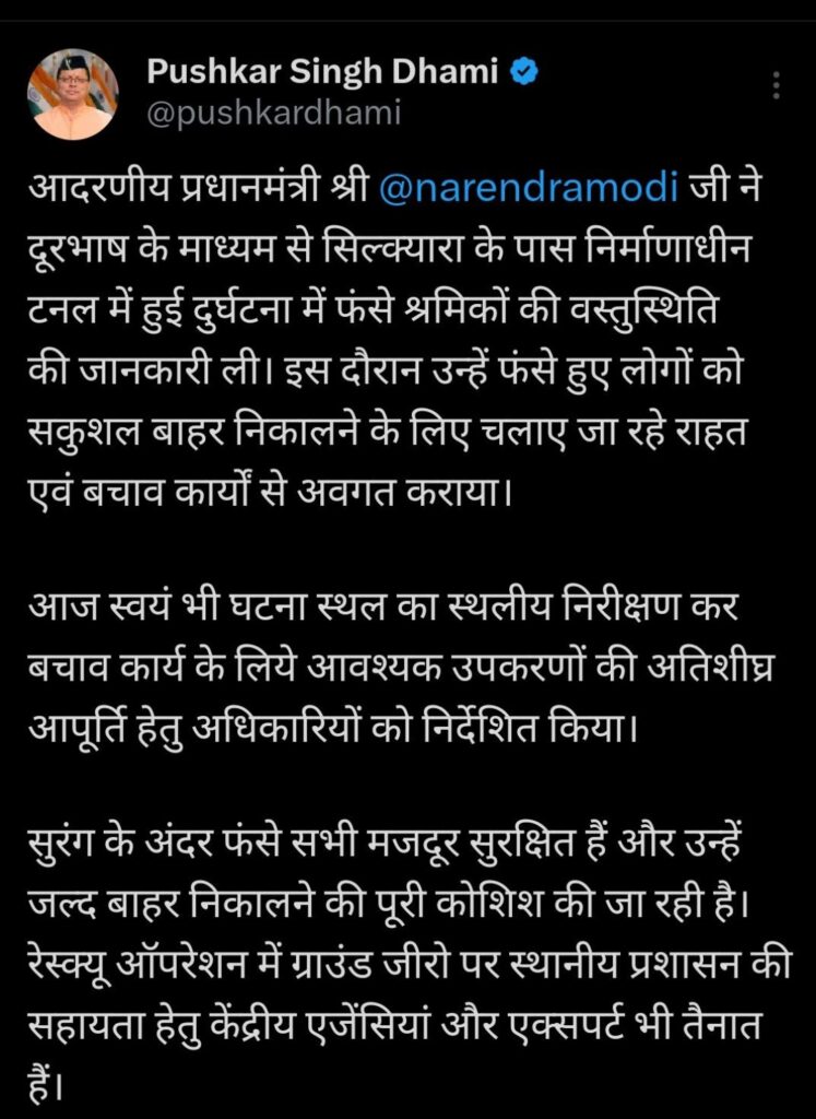 मुख्यमंत्री पुष्कर सिंह धामी ने बताया कि कि विभिन्न राज्य और केंद्रीय एजेंसियां परस्पर समन्वय और तत्परता के साथ राहत और बचाव कार्य में जुटी हैं। सीएम धामी ने सोशल मीडियो प्लेटफॉर्म एक्स पर लिखा, प्रधानमंत्री ने दूरभाष के माध्यम से सिल्क्यारा के पास निर्माणाधीन टनल में हुई दुर्घटना में फंसे श्रमिकों की वस्तुस्थिति की जानकारी ली। इस दौरान उन्हें फंसे हुए लोगों को सकुशल बाहर निकालने के लिए चलाए जा रहे राहत एवं बचाव कार्यों से अवगत कराया।