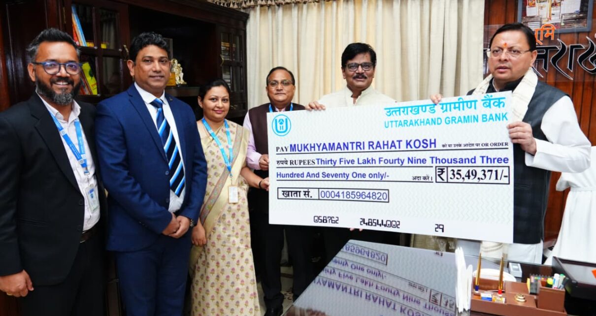 देहरादून। मुख्यमंत्री पुष्कर सिंह धामी से शनिवार को मुख्यमंत्री कैंप कार्यालय में उत्तरांचल ग्रामीण बैंक के प्रतिनिधियों ने भेंट की। इस दौरान बैंक प्रतिनिधियों ने उत्तराखंड में आपदा प्रभावितों की सहायता एवं पुनर्निर्माण कार्यों के लिए ₹ 35,49,371 की धनराशि मुख्यमंत्री राहत कोष में प्रदान की।