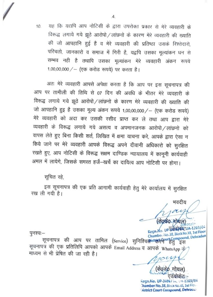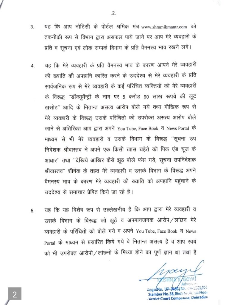 देहरादून । उत्तराखण्ड सूचना एवं लोक संपर्क विभाग में उपनिदेशक मनोज कुमार श्रीवास्तव द्वारा न्यूज़ पोर्टल श्रमिक मंत्र के पत्रकार आलोक शर्मा को एक करोड़ रुपए मानहानि का नोटिस भेजा गया है। मनोज कुमार श्रीवास्तव ने यह नोटिस अपने अधिवक्ता के माध्यम से भिजवाया है। नोटिस में आरोप लगाया गया है कि न्यूज़’ पोर्टल श्रमिक मंत्र द्वारा मनोज श्रीवास्तव की छवि खराब करने के लिए झूठे, अनर्गल और बेबुनियाद आरोप लगाते हुए पोर्टल पर न्यूज़ प्रसारित की गई है। जिससे उनकी समाज में मानहानि हुई है। नोटिस में न्यूज़ पोर्टल को हिदायत दी गई है कि वह नोटिस मिलने के 07 दिन के भीतर मेरे क्लाइंट मनोज कुमार श्रीवास्तव को एक करोड़ रुपए देकर उसकी रसीद प्राप्त कर ले या बिना शर्त सार्वजनिक रूप से माफी मांग कर उसे खबर का खंडन कर ले, नहीं तो मेरा क्लाइंट आपके खिलाफ कानूनी कार्रवाई करने के लिए स्वतंत्र होगा।