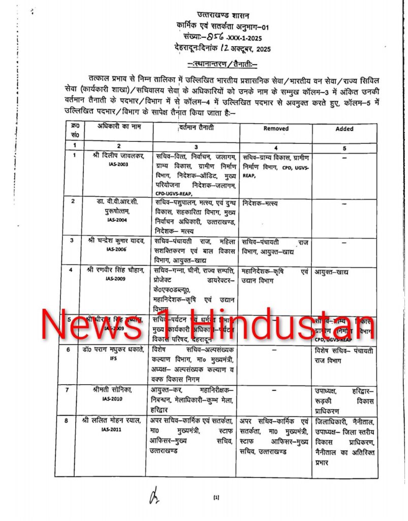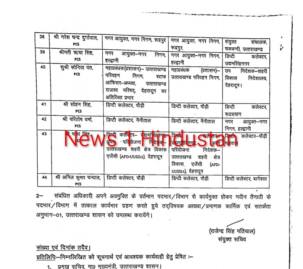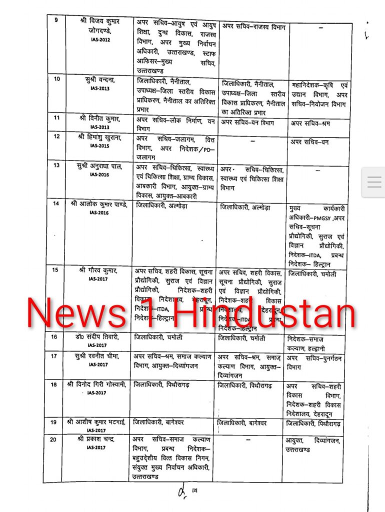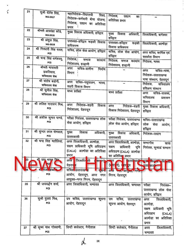 देहरादून। उत्तराखण्ड की धामी सरकार ने राज्य में बड़ा फेरबदल करते हुए 44 अधिकारियो के कार्यक्षेत्र में बड़ा परिवर्तन किया है। जिसमे 23 आईएएस सहित 21 PCS अधिकारियो का तबादला किया गया है। किसको कहा से कहा भेजा गया है ? आप खुद ही देख ले लिस्ट –