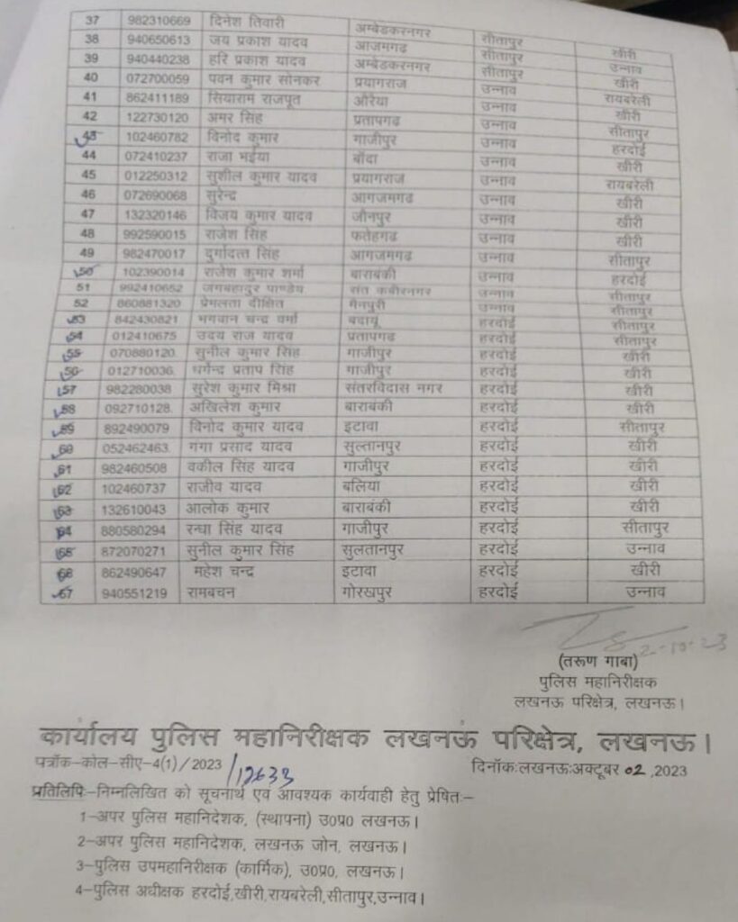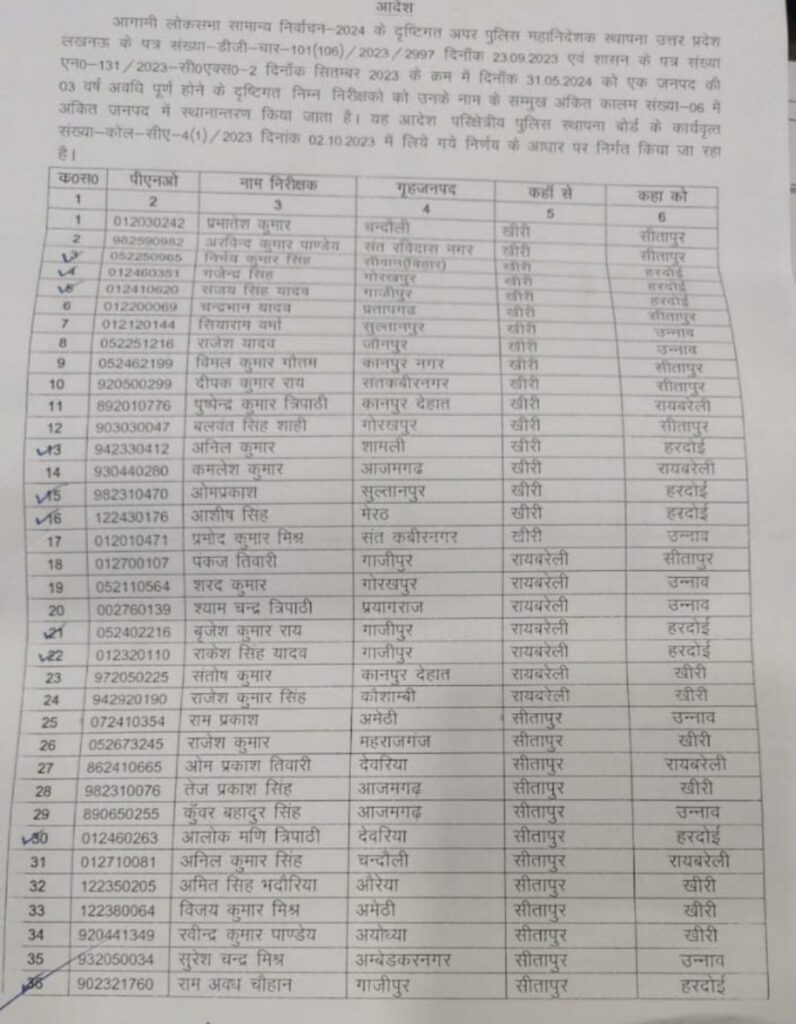 लखनऊ। उत्तर प्रदेश के लखनऊ जोन में 67 इंस्पेक्टर के तबादले किए गए। जिले में 3 साल समय पूरा कर चुके निरीक्षकों के ट्रांसफर हुए है। मन जा रहा है कि लोकसभा चुनाव के मद्देनजर ट्रांसफर किया गया है। किसको कहा से कहा भेजा गया है ? आप खुद ही देख ले लिस्ट –