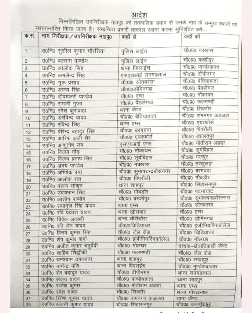 गोरखपुर। एसएसपी गोरखपुर ने 38 उप निरीक्षकों का किया तबादला। कई को मिली पुलिस चौकी का प्रभार। ज्यादा जानकारी के लिए आप खुद ही देख ले लिस्ट –