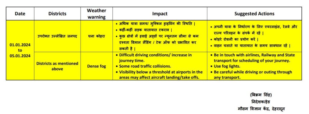 मौसम विज्ञान केंद्र की ओर से एक जनवरी से 05 जनवरी तक के लिए देहरादून, पौड़ी, नैनीताल, हरिद्वार, ऊधमसिंह नगर जिले में कोहरे का येलो अलर्ट जारी किया गया है। रविवार को सुबह-सुबह घने कोहरे का प्रभाव रहा। इसके साथ ही उत्तरी हवाएं चलने से लोगों को ठंड ने परेशान किया।