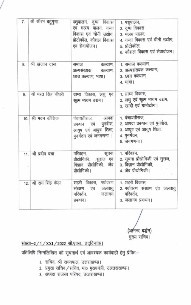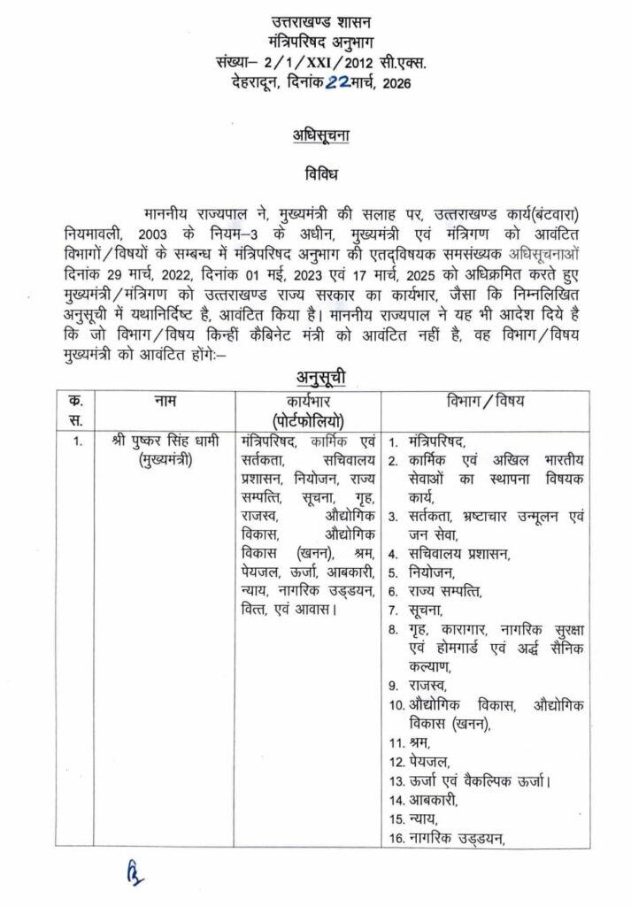हमारी सरकार के बीते चार साल, सेवा, सुशासन और जनकल्याण को समर्पित रहे हैं, इसी क्रम में मंत्रिमंडल में नए शामिल सदस्यों सहित मंत्रिमंडल के सभी सहयोगियों के मध्य कार्य आवंटन भी कर दिया गया है। मंत्रिमंडल के सभी सदस्य अनुभवी हैं और जनसेवा से गहराई से जुड़े हैं।जनसेवा को सर्वोपरी रखते हुए, उत्तराखंड को विकसित भारत का अग्रणी एवं श्रेष्ठ राज्य बनाने में पूरी सरकार अपना योगदान प्राणोप्रण से देगी।हम सभी को उत्तराखंड की सवा करोड़ देवतुल्य जनता की सेवा करने का मौका मिला है, और यह सेवा भाव ही हमें अपनी देव तुल्य जनता के सपनों एवं आकांक्षाओं को पूर्ण करने के लिए सदैव प्रेरित करता है।
