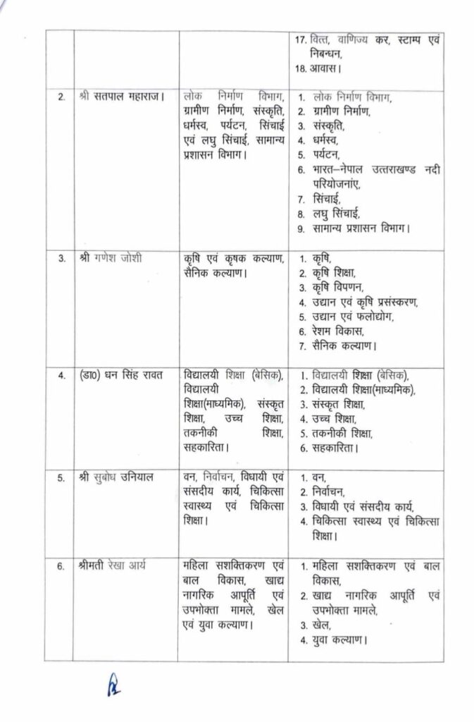 मंत्री धन सिंह रावत से स्वास्थ विभाग हटाकर सुबोध उनियाल को दिया गया है। वहीं, मंत्री गणेश जोशी से ग्राम्य विकास हटाकर नए मंत्री भरत चौधरी को दिया गया है। सतपाल महाराज से पंचायती राज विभाग हटाकर नए मंत्री मदन कौशिक को दिया गया।