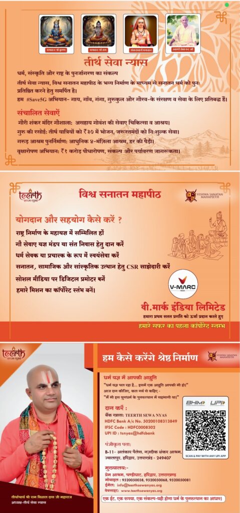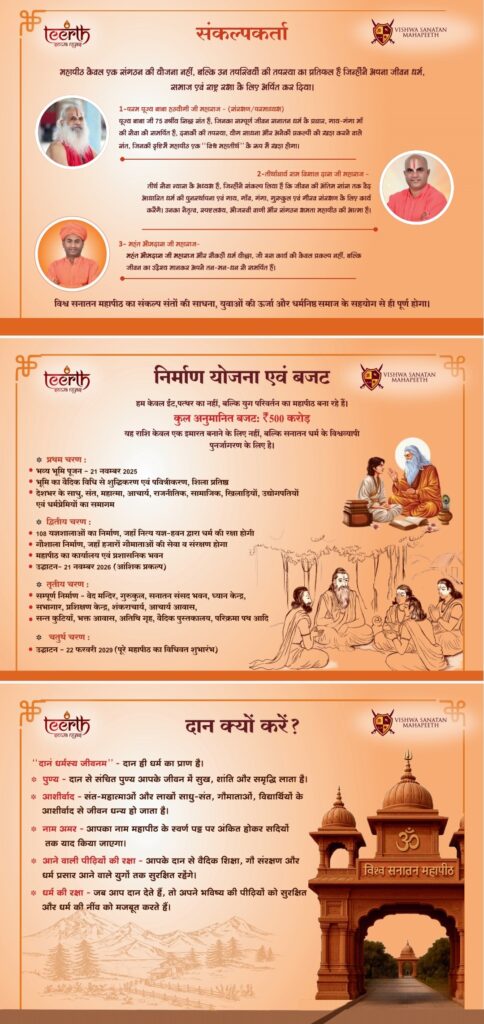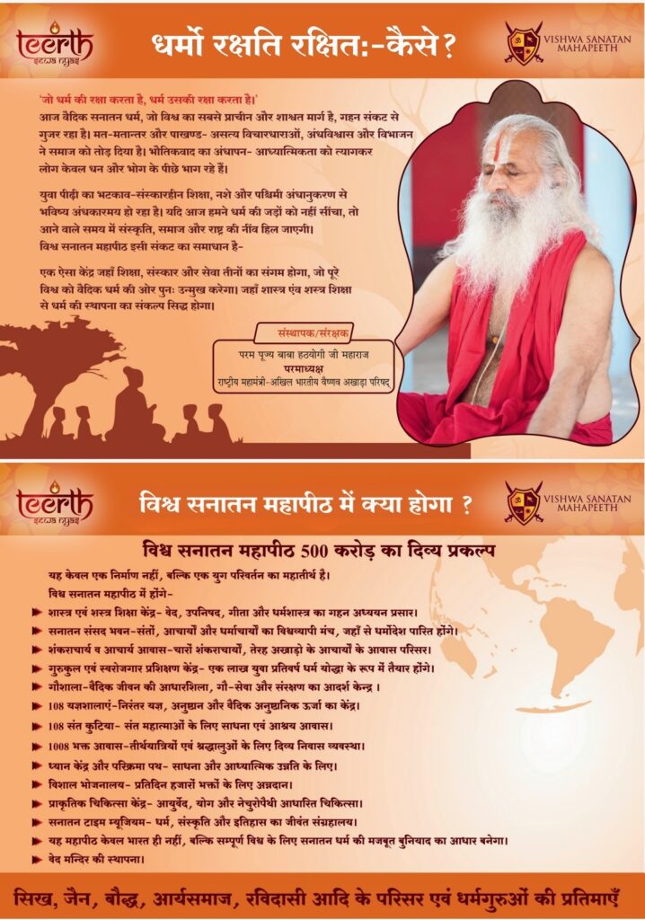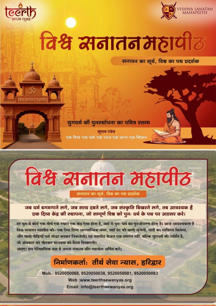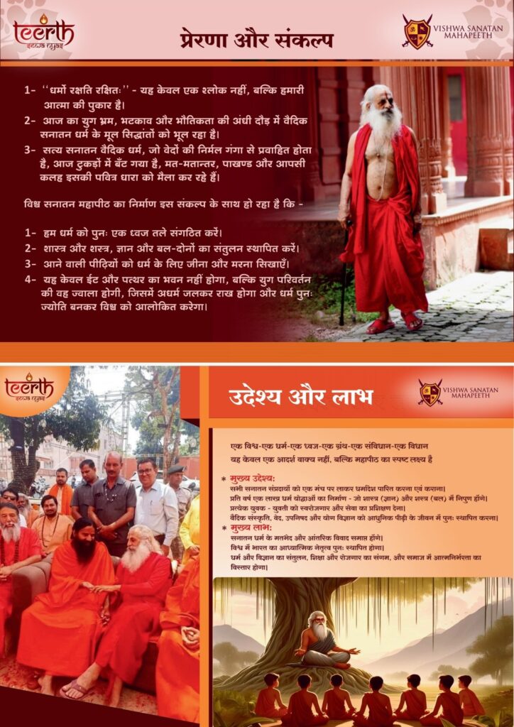 विश्व सनातन महापीठ” में भारत की तेरहों अखाड़ों सहित सिख, जैन, बौद्ध, आर्य समाज, रविदास, कबीर, नाथ और अन्य सभी सनातन परंपराओं के लिए अलग उद्देश्य परिसर निर्मित किए जाएंगे। इन सभी परिसर में उनके धर्मगुरुओं की प्रतिमाएँ, शिक्षाएँ, और ऐतिहासिक योगदान को प्रदर्शित किया जाएगा – जिससे आने वाली पीढ़ियाँ जान सकें कि सनातन परंपरा का विस्तार केवल भारत नहीं, बल्कि समस्त मानवता तक है। तीर्थ सेवा न्यास के तत्वावधान में बन रही इस सनातन पीठ का 21 नवंबर को भूपतवाला में देशभर के धर्माचार्यों की मौजूदगी में शिला पूजन किया जाएगा।
