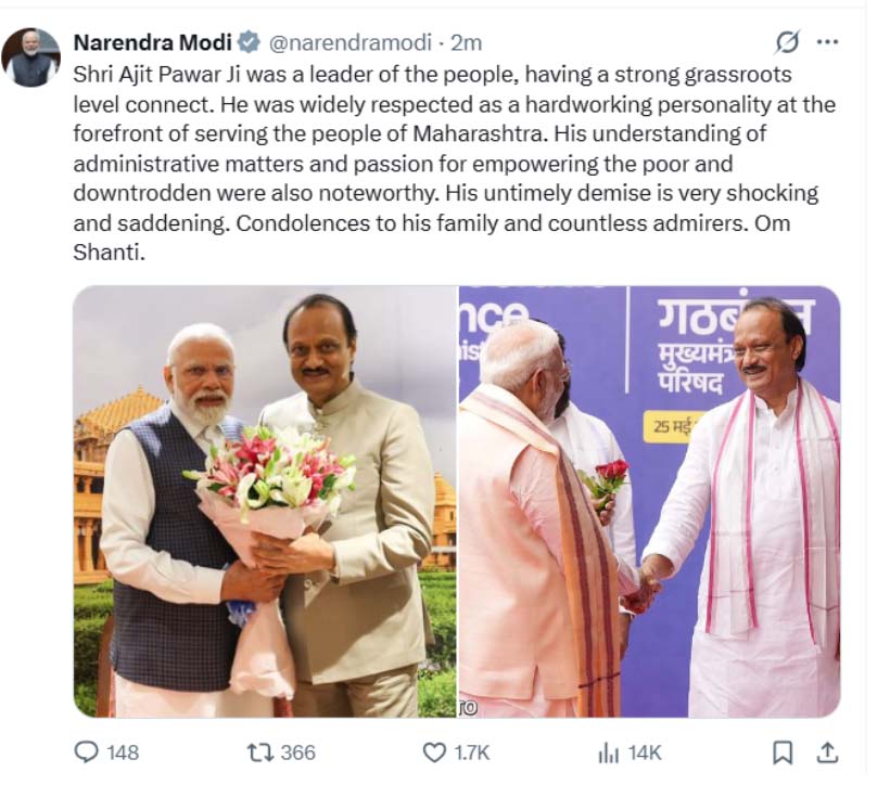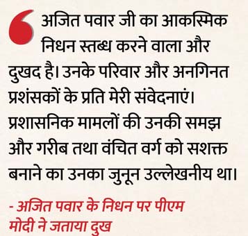 पीएम मोदी ने लिखा, ‘अजित पवार जी लोगों के नेता थे, जिनका जमीनी स्तर पर मजबूत संबंध था। उन्हें महाराष्ट्र के लोगों की सेवा में मेहनती और समर्पित व्यक्ति के रूप में व्यापक सम्मान मिला। प्रशासनिक मामलों की उनकी समझ और गरीब व वंचितों को सशक्त बनाने का उनका जुनून भी उल्लेखनीय था। उनका आकस्मिक निधन बेहद स्तब्ध करने वाला और दुखद है। उनके परिवार और अनगिनत प्रशंसकों के प्रति मेरी संवेदनाएं। ॐ शांति।’