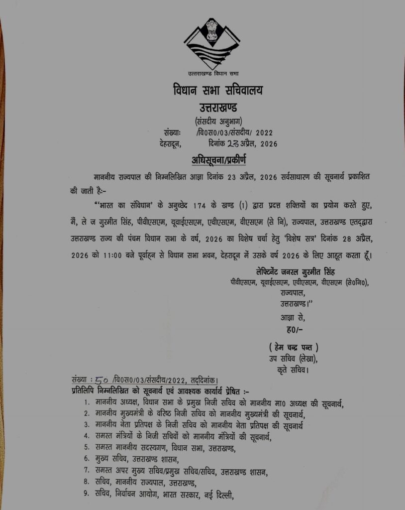 देहरादून। नारी के लोकतंत्र में अधिकार विषय को लेकर उत्तराखंड विधानसभा का विशेष सत्र 28 अप्रैल को होने जा रहा है। राज्यपाल, लेफ्टिनेंट जनरल गुरमीत सिंह (सेवानिवृत्त) ने आज इस विशेष विधानसभा सत्र को आहूत करने के संबंध में आधिकारिक अधिसूचना जारी कर दी है। इसके साथ ही विधानसभा सचिवालय ने इसकी तैयारी शुरू कर दी है।