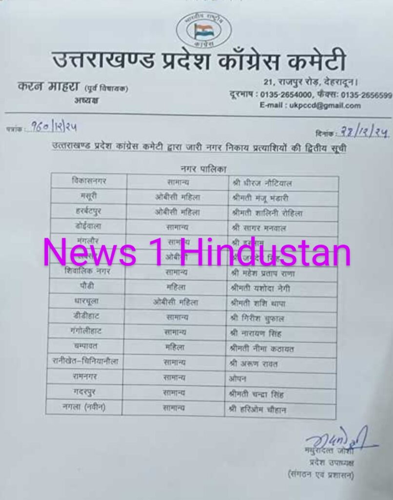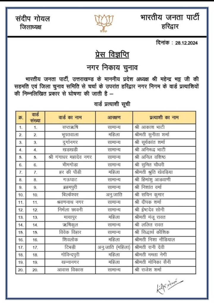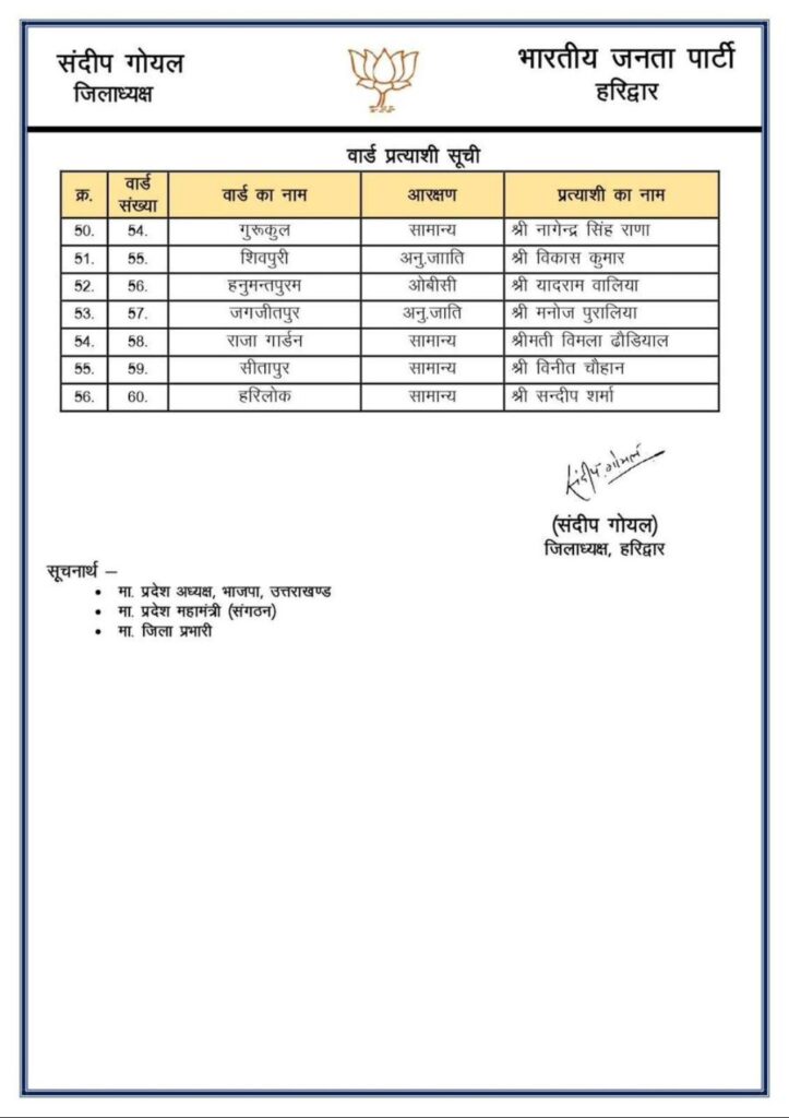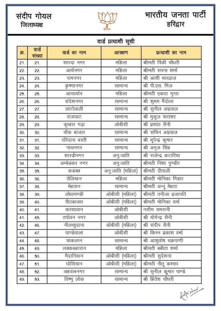 हरिद्वार। निकाय चुनाव की सरगर्मियों के बीच देर रात भाजपा ने नगर निगम हरिद्वार के 56 वार्डो के प्रत्यासियो के नामो की घोषणा कर दी तो वही कांग्रेस ने शिवालिक नगर नगर पालिका चेयरमैन पद पर घोषणा कर दी।