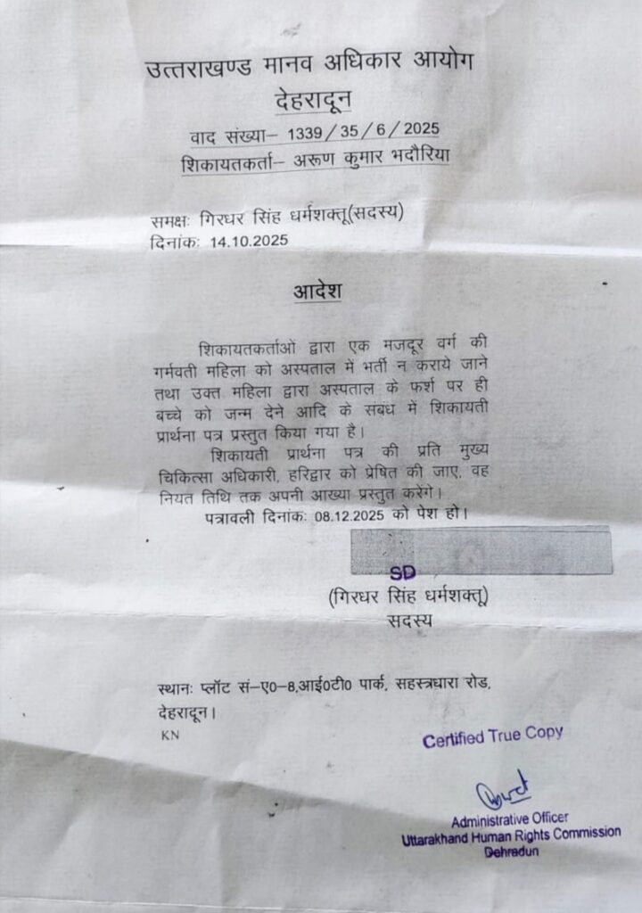 हरिद्वार / देहरादून। सरकारी हॉस्पिटल हरिद्वार में गर्भवती महिला को भर्ती न किए जाने तथा उक्त महिला द्वारा अस्पताल के फर्श पर ही बच्चे को जन्म देने के मामले में उत्तराखण्ड मानवाधिकार आयोग ने कड़ा रुख अपनाते हुए मुख्य चिकित्सा अधिकारी हरिद्वार से आगामी 08 दिसम्बर 2025 तक इस संबंध में आख्या स्पष्ट मांगी है और यह भी चेतावनी दी है कि आयोग के उपरोक्त आदेश के अपेक्षाअनुरूप कार्रवाई न किए जाने की स्थिति में आयोग द्वारा विचारों प्रांत यथाचित आदेश पारित कर दिए जाएंगे।