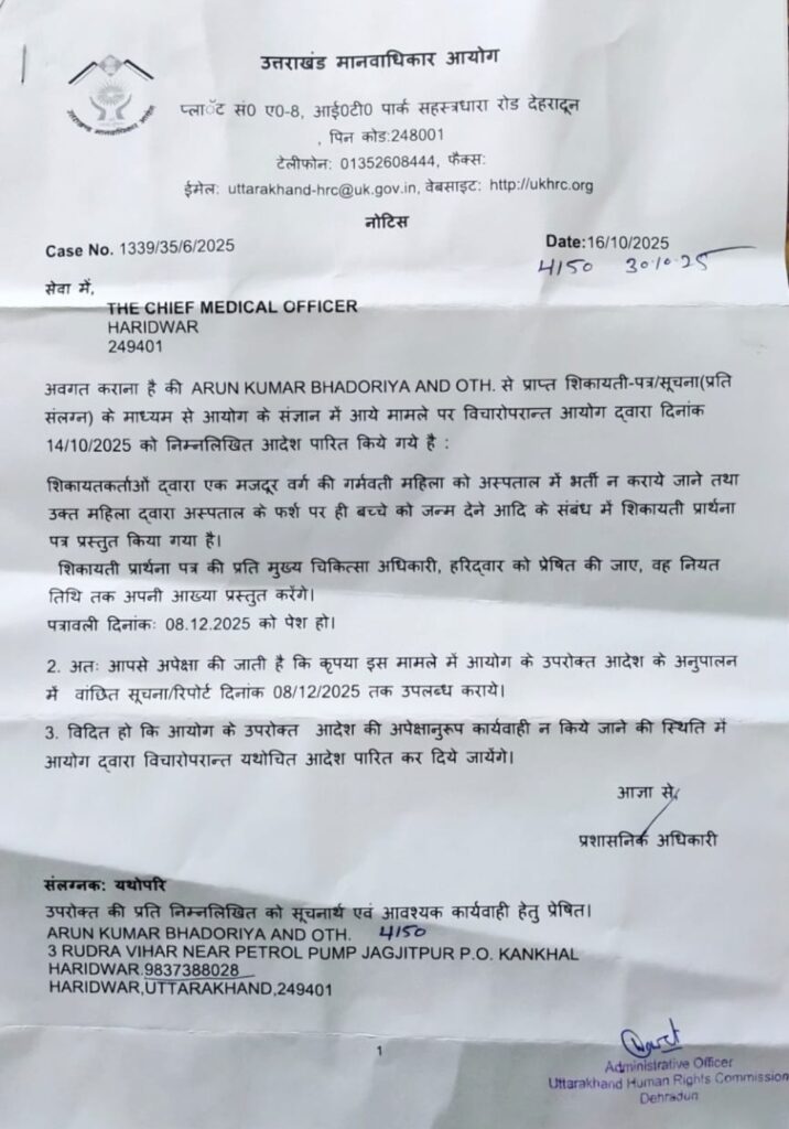 आपको बता दे कि इस संबंध में हरिद्वार से अरुण भदोरिया एडवोकेट व कमल भदोरिया एडवोकेट व चेतन भदोरिया LLB अध्यनरत निवासी जगजीतपुर ने मानवाधिकार आयोग उत्तराखंड में एक याचिका दाखिल की थी जो दिनांक 16 अक्टूबर 2025 में आयोग द्वारा रजिस्टर्ड करके इस संबंध में मुख्य चिकित्सा अधिकारी हरिद्वार से रिपोर्ट तलब की है।