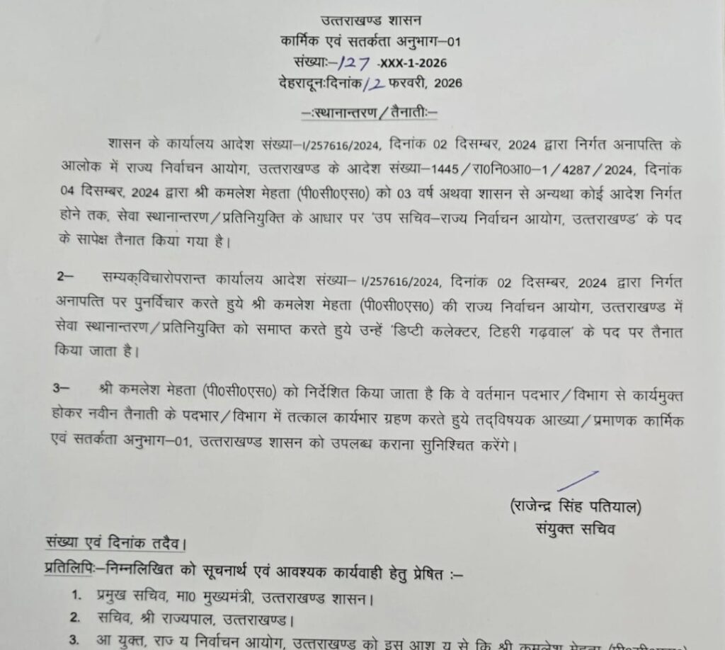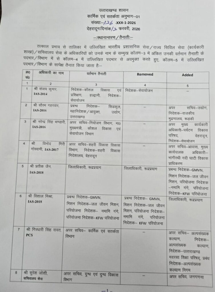 देहरादून । उत्तराखंड सरकार ने देर रात शासन में 06 आईएएस सहित 12 PCS ,सचिवालय अधिकारियो के कार्यक्षेत्र में बड़े परिवर्तन किया है। इसी क्रम में रुद्रप्रयाग के जिलाधिकारी को भी हटा दिया गया है। किसको कहा से कहा भेजा गया है ? आप खुद ही देख ले लिस्ट –