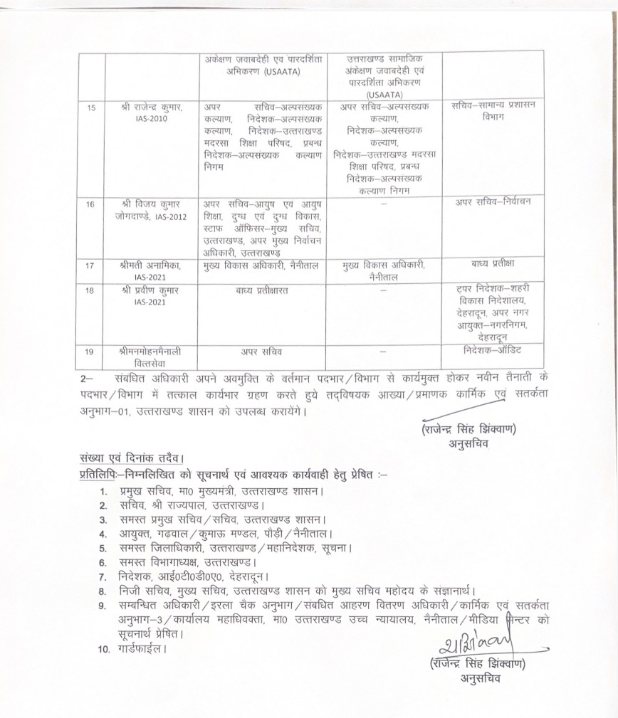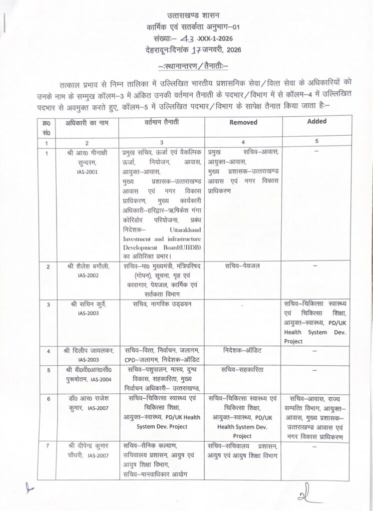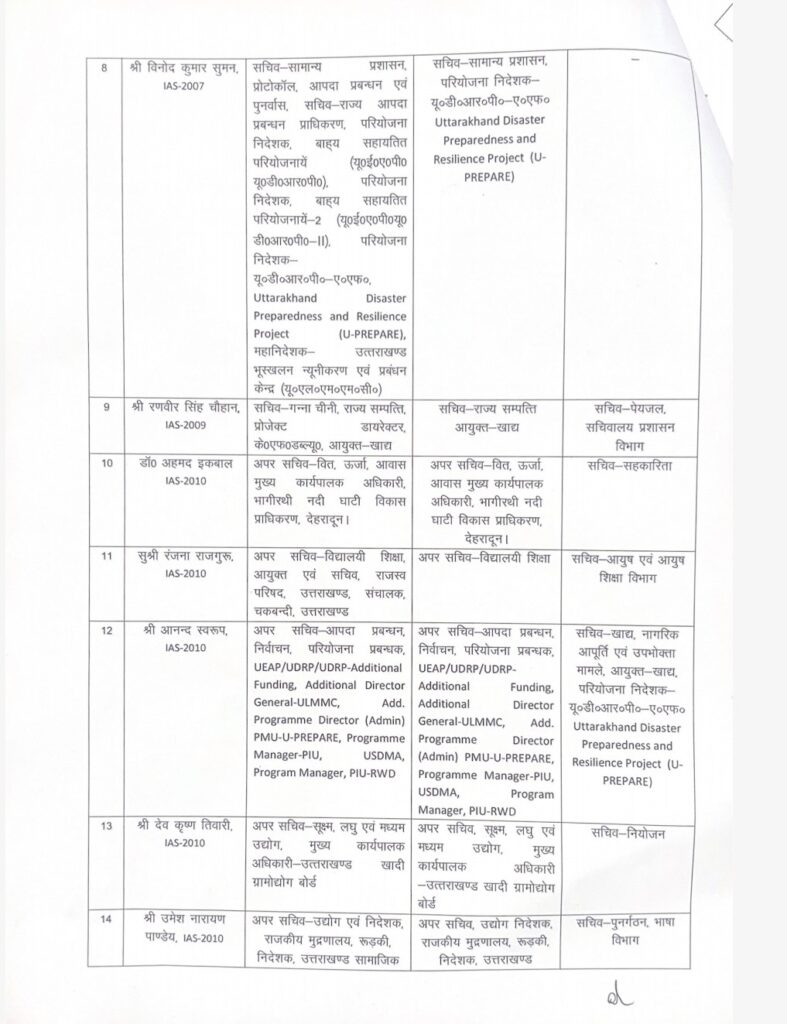 देहरादून। उत्तराखण्ड शासन ने देर रात 30 Ias व Pps अधिकारियो के कार्यक्षेत्र में किया बड़ा फेर बदल करते हुए ट्रांसफर किये है। किसको कहा से कहा और क्या नई जिम्मेदारी दी गई ? आप खुद ही देख लिस्ट –