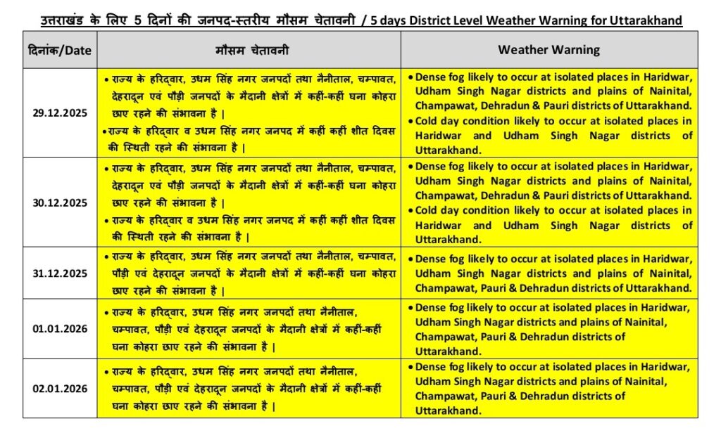 पूर्वानुमान के अनुसार देहरादून, पौड़ी, हरिद्वार, ऊधमसिंह नगर, चंपावत और नैनीताल जिले के कुछ हिस्सों में सोमवार को घना कोहरा छाया रह सकता है। हालांकि अन्य जिलों में मौसम शुष्क रहेगा। मौसम वैज्ञानिकों का कहना है कि कोहरा छाने से पर्वतीय इलाकों के साथ मैदानी क्षेत्रों में भी सूखी ठंड परेशान करेगी। इसके अलावा 30-31 दिसंबर से दो जनवरी तक उत्तरकाशी, चमोली, पिथौरागढ़ और रुद्रप्रयाग जिले के कुछ हिस्सों में बारिश-बर्फबारी के आसार हैं।