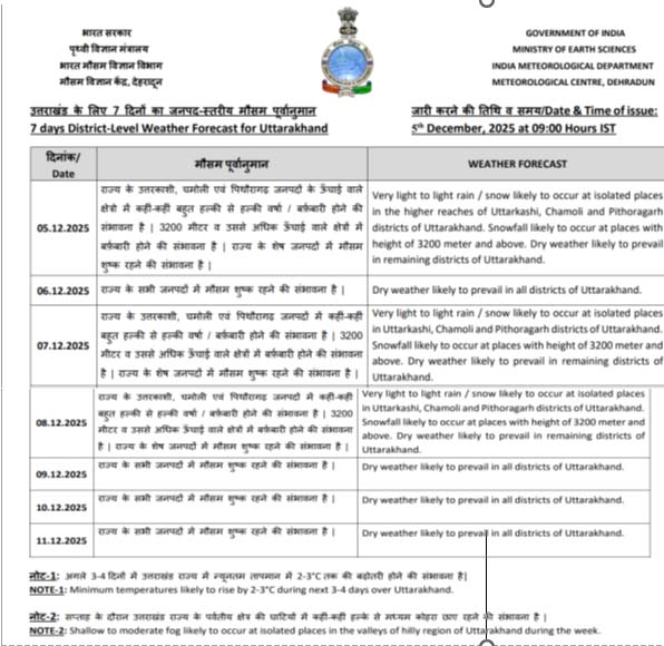 खासकर उत्तरकाशी, चमोली और पिथौरागढ़ जिले के कुछ हिस्सों में हल्की बारिश हो सकती है। साथ ही 3200 मीटर से ऊंचाई वाले इलाकों में बर्फबारी की संभावना है। अगले ही दिन यानि छह दिसंबर को एक बार फिर मौसम साफ होगा, लेकिन सात और आठ दिसंबर को पर्वतीय इलाकों में बारिश और बर्फबारी की संभावना है। मौसम वैज्ञानिकों का कहना है कि बारिश-बर्फबारी होने से निश्चित तौर से तापमान में गिरावट तो आएगी लेकिन सूखी ठंड से राहत मिलेगी।